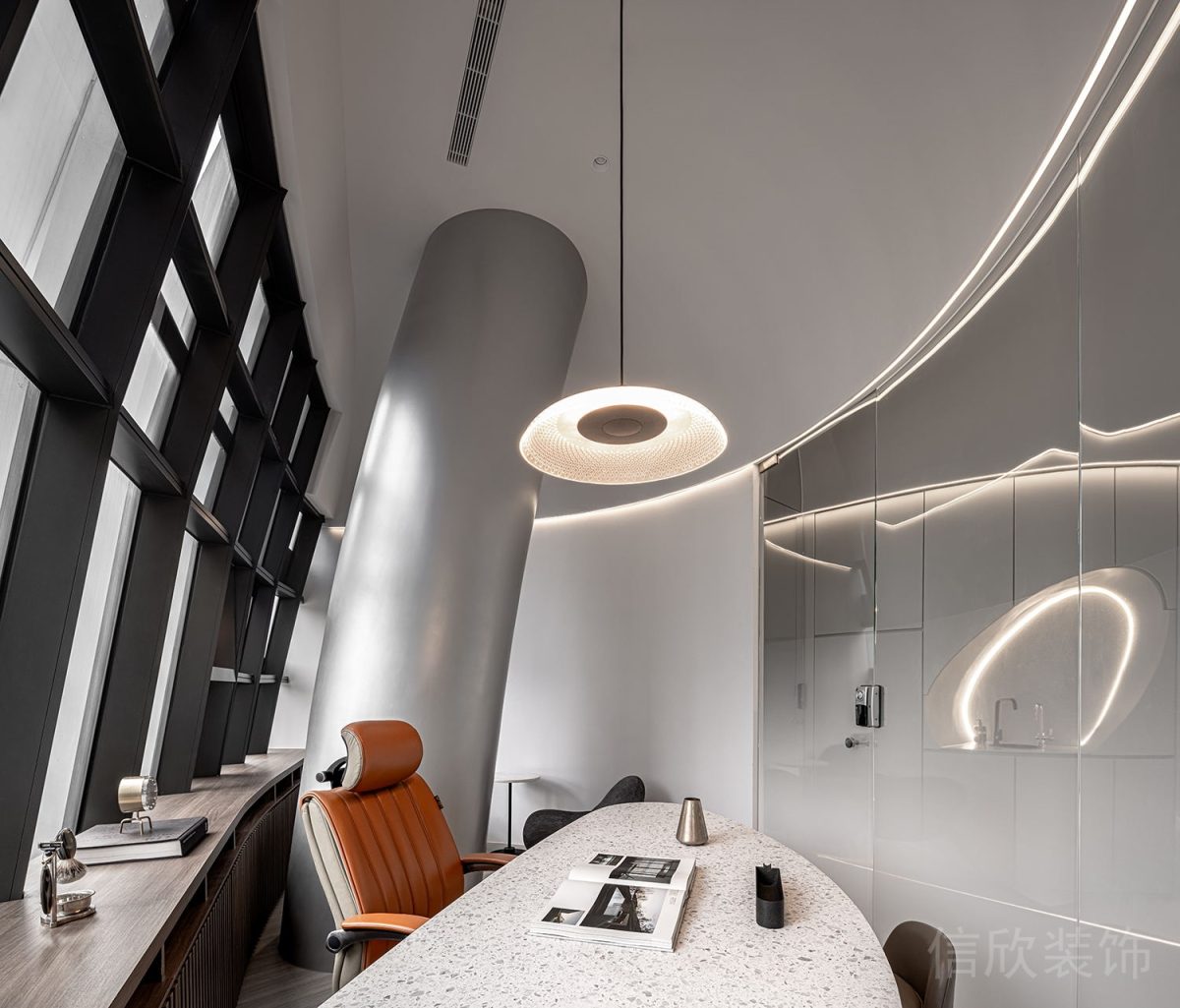半墻部分使用原木風(fēng),營造自然、舒適的辦公環(huán)境。用木紋貼面結(jié)合實(shí)木材料。