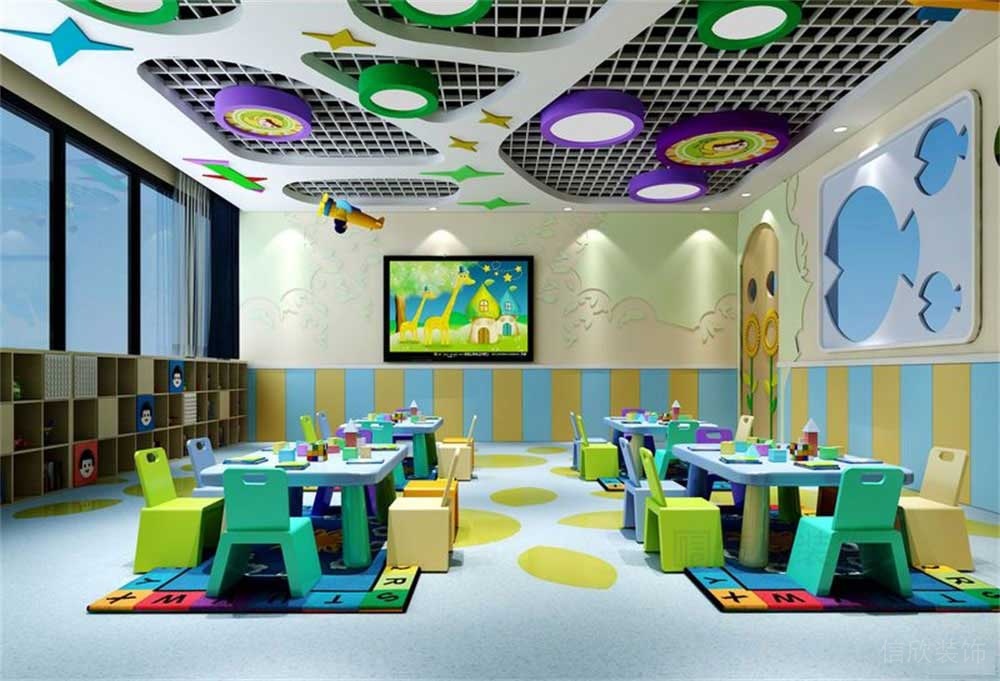 暖暖的太陽吊頂,彩虹一樣的背景墻,七色花瓣的課桌椅,增加了上課的交流性和趣味性,盡情的發揮孩子的想象,和對世界的無限好奇。