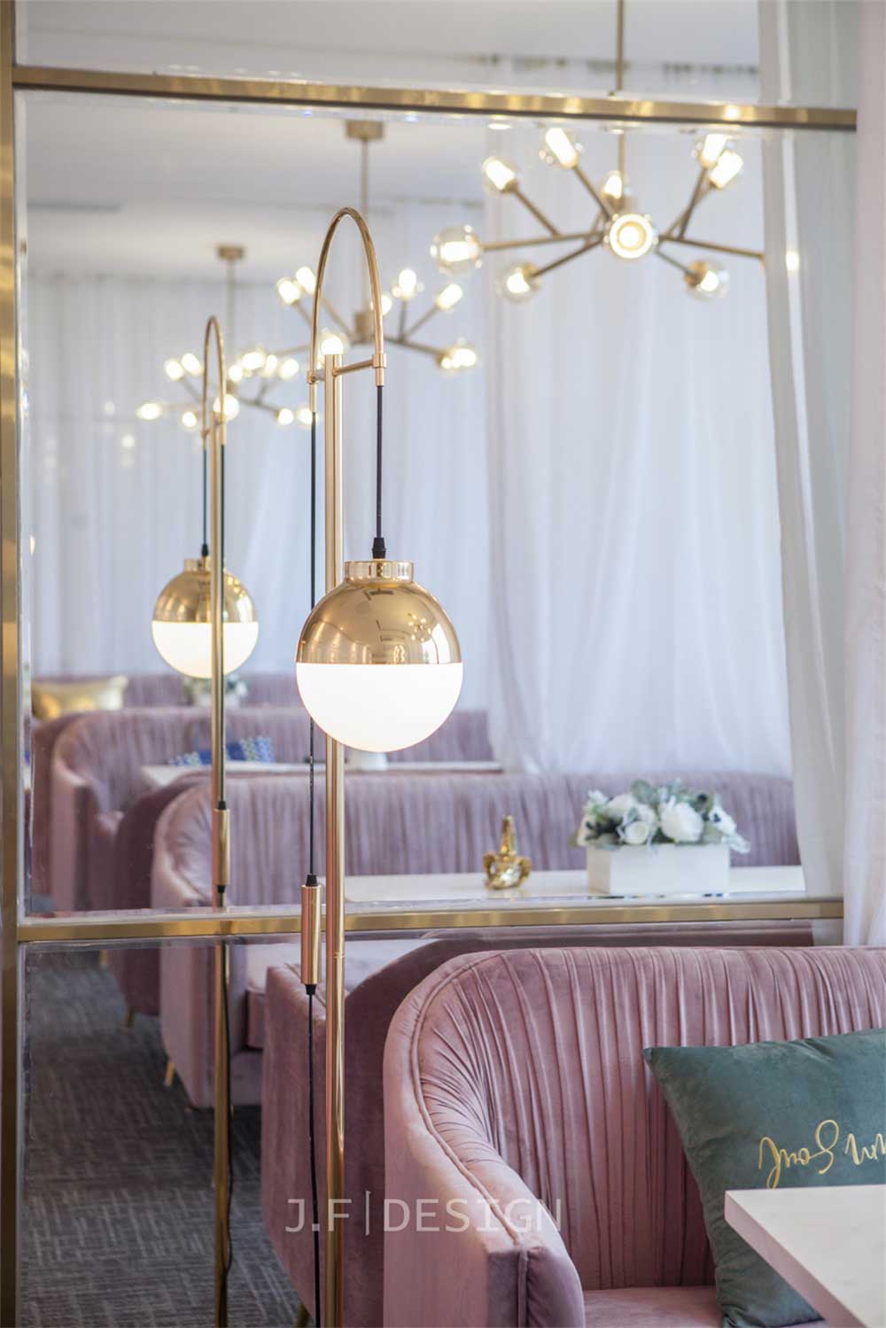 前廳采用了半圓弧玻璃背景墻,香檳金包邊的設計,搭配白色的前臺,和球形吊燈,把前廳和辦公區做了一個空間的區分,同時也能勾起人們的探索欲望,想要一睹內部芳容。洽談區和接待區通過相同的香檳金立式臺燈,和吊燈的設計,白色的窗簾,粉紅色的天鵝絨沙發,精致的家具組合不僅能凸顯高雅的氣氛,也能通過一個個小區域的劃分,體現出入西餐廳般互不打擾的精致生活方式。吧臺區設有高腳椅,和金屬大理石結合的吧臺,整面金屬的背景墻,在白色的整體背景下,凸出了存在感和貴族般的氣質。