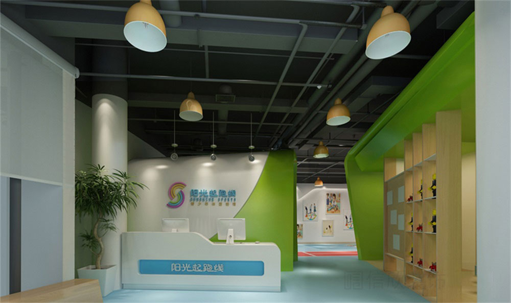 前臺的設計,采用簡單的藍色和白色的搭配,如天空般純凈明媚,旁邊翠綠色火車頭造型一樣的休息區,生動形象,卡通活躍,深受孩子們喜愛。