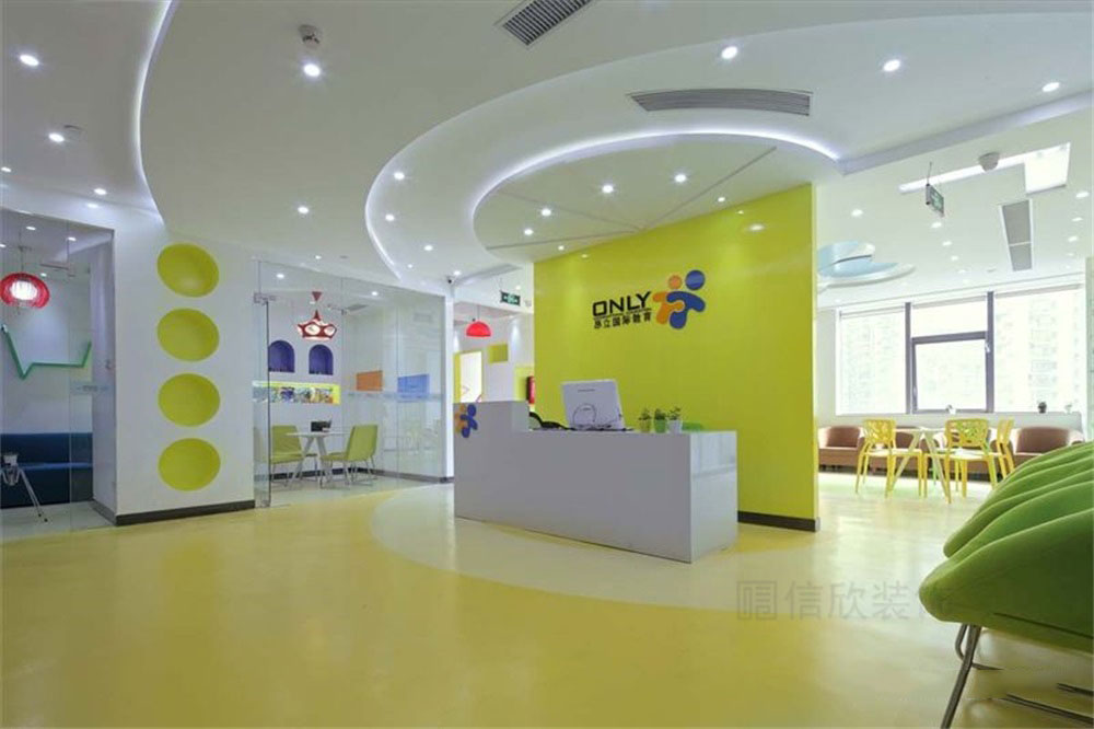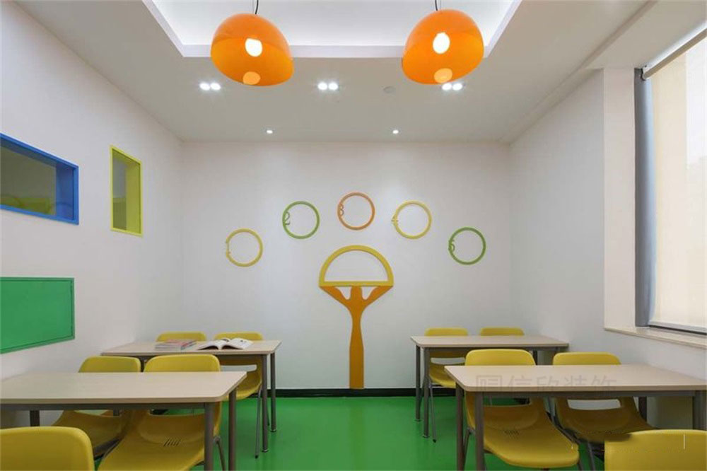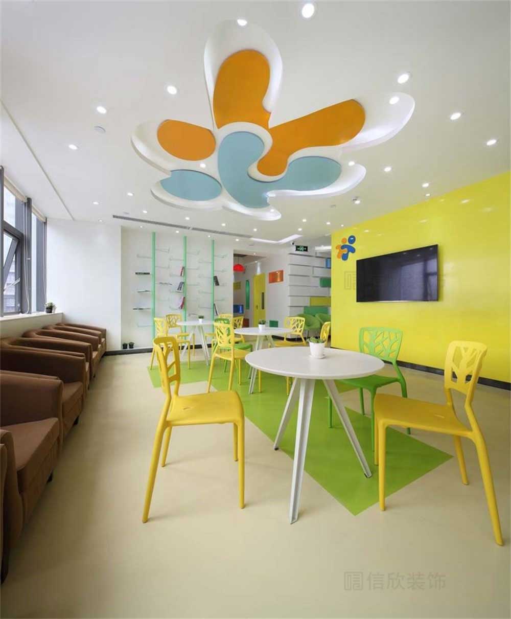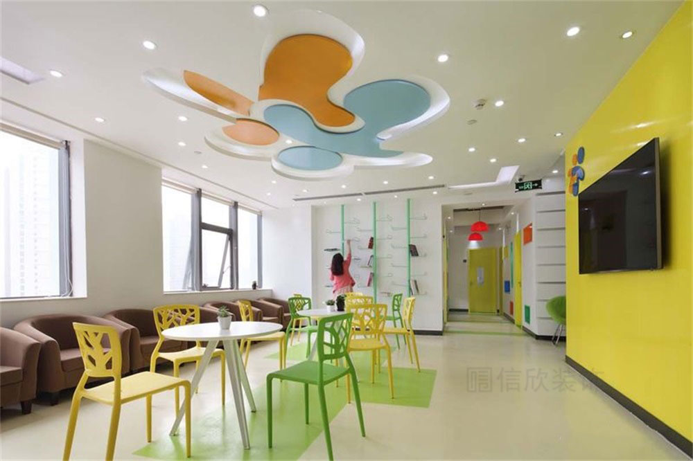 等候區(qū)采用一體式的石膏頂,加上鏤空的造型設(shè)計(jì),如七色花一樣的閃耀,讓孩子對(duì)學(xué)校也充滿了向往和喜愛。