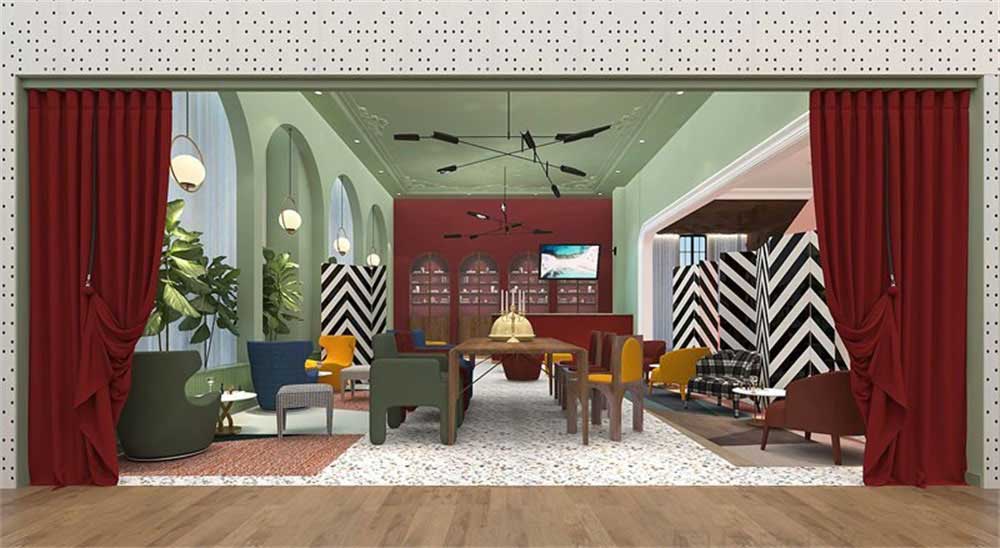 獨立的小洽談區(qū),在粉紅色和藍(lán)色碎花的點綴下,猶如童話鎮(zhèn)里鉆石版閃耀的場景,在這里不論是休閑還是洽談,都能感受到童話世界中的神奇感。