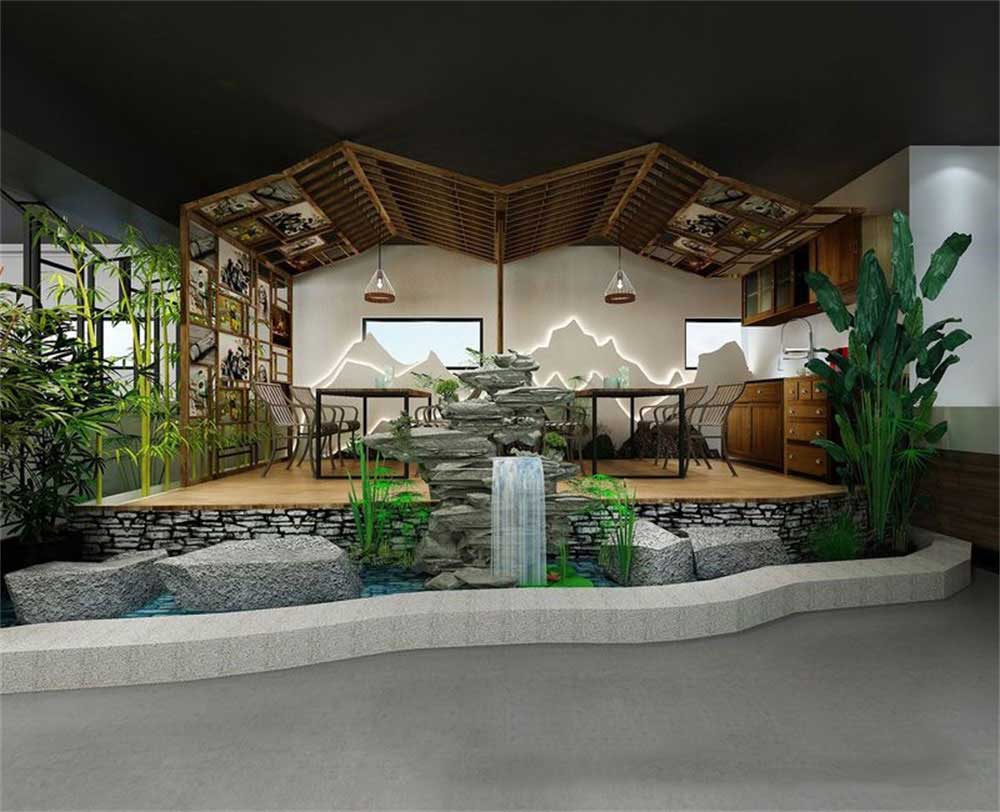 前臺(tái)及展示區(qū)背景墻采用不規(guī)則造型,設(shè)計(jì)師采用山水意境、現(xiàn)代的材料營造出一幅禪意水墨畫,遠(yuǎn)處的遠(yuǎn)山虛虛實(shí)實(shí),十分具有中式禪韻。