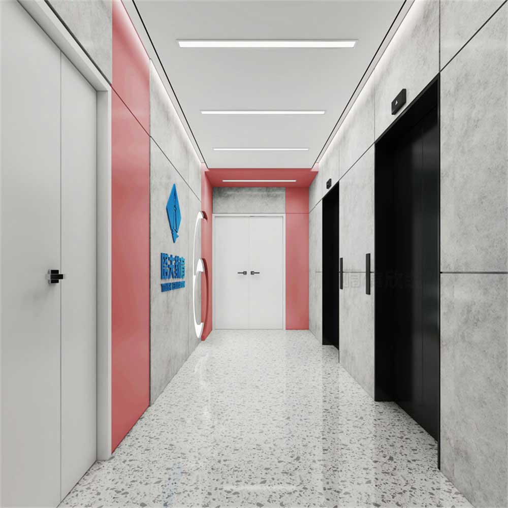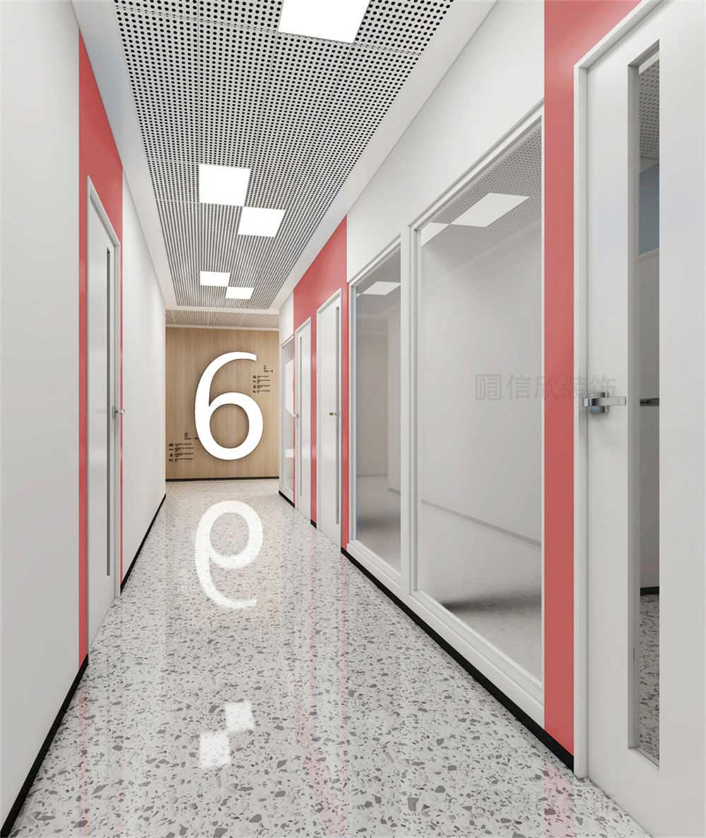 過道采用格柵頂加人造石地面的鋪設,再加上綠色的點綴,清爽干凈,原木色的logo醒目,有一種簡潔的高級感。