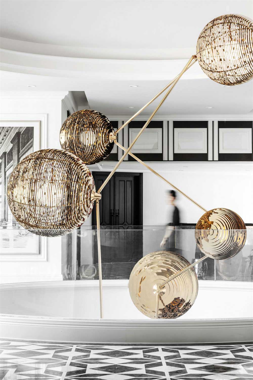熊貓文化產(chǎn)業(yè)辦公空間的大廳,以黑白兩色的素雅設(shè)計(jì),搭配球形的香檳金吊燈,體現(xiàn)出現(xiàn)代輕奢的優(yōu)雅。