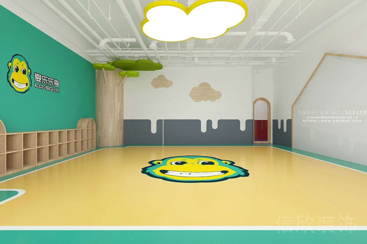 彈力地板映襯可愛猴子logo圖案,吊頂蝴蝶LED燈光,墻面童趣可愛設計。