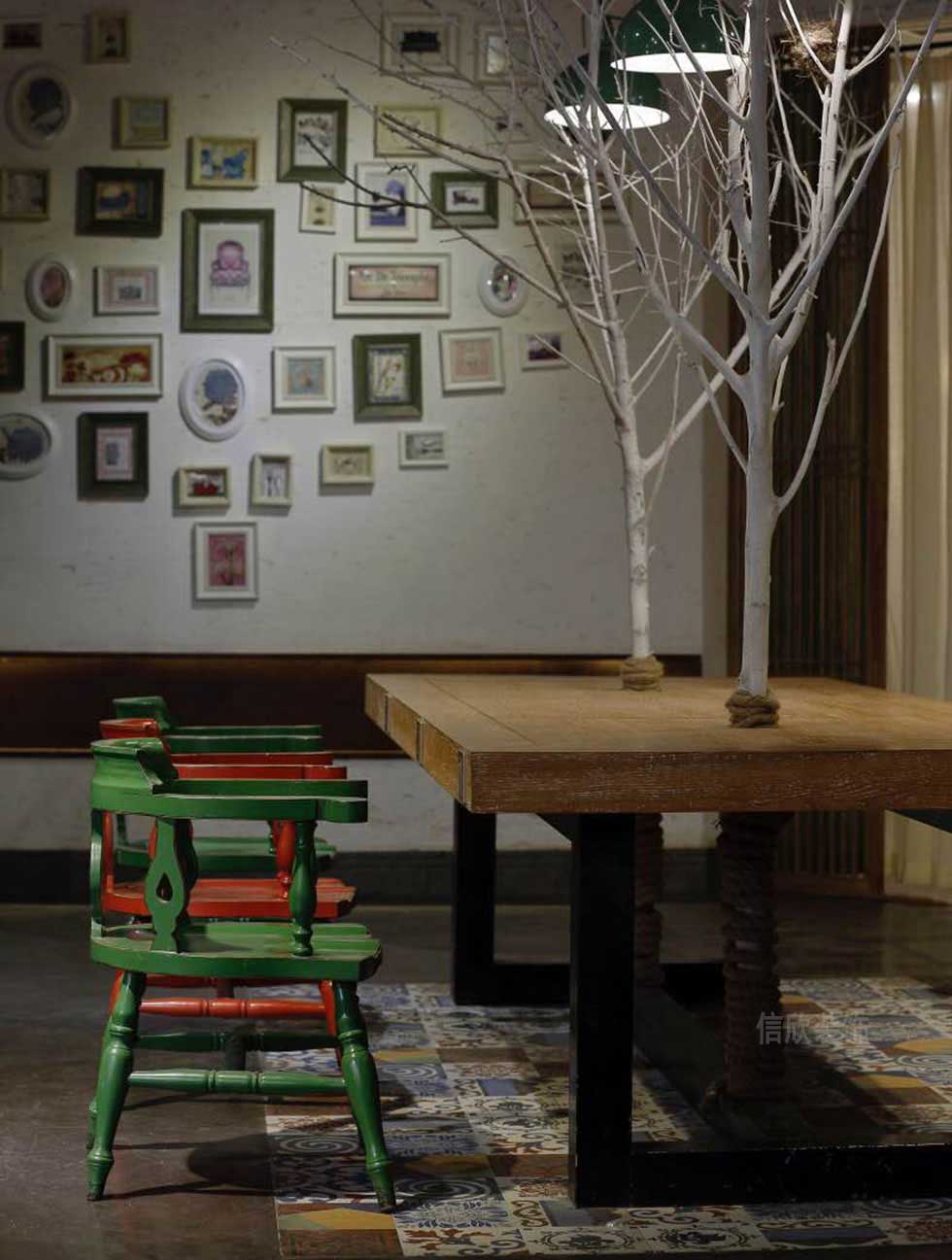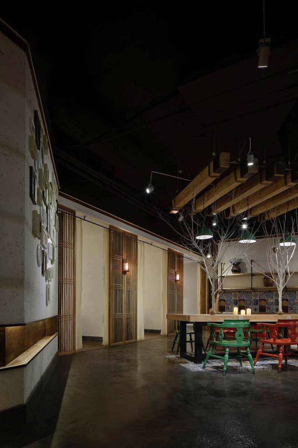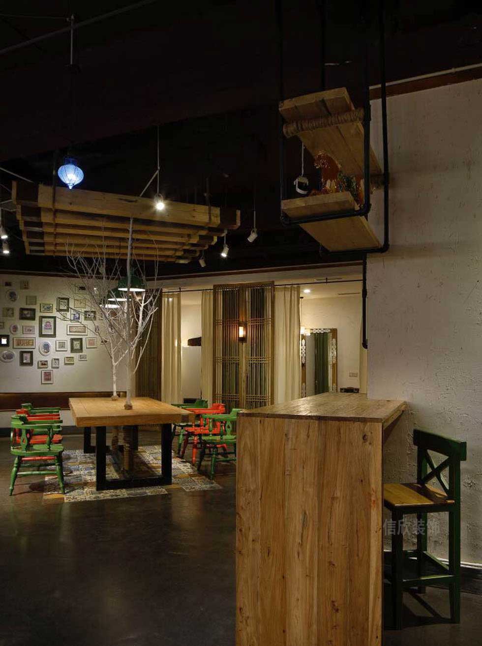 原始頂面的基礎(chǔ)上,加了實(shí)木格柵吊頂,降低了層高的同時(shí)也凸出了空間感,古舊的桌椅,加上枯枝的桌面擺件,給人一種獨(dú)特的東方文化的神秘感。