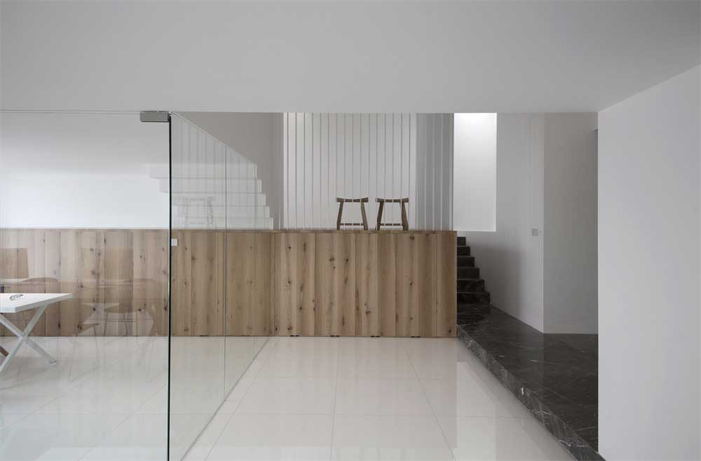 原木系的護墻板包邊,黑色大理石的樓梯的過道,設計新穎,理念前衛。