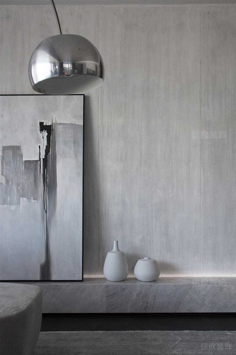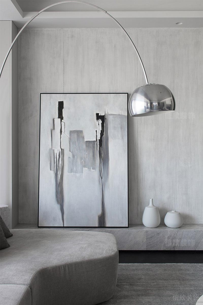 灰色的壁紙,搭配白色裝飾物的素白更顯一種素雅之美,巨幅的抽象畫,顯示出主人更注重內(nèi)心世界的追求。
