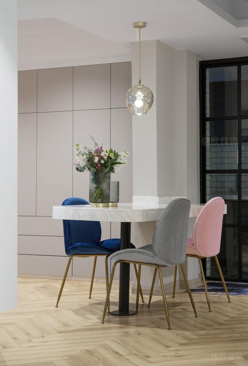 不同色彩的餐椅搭配,天然石材的餐桌,回歸童年般的,夢幻純真的用餐環(huán)境。