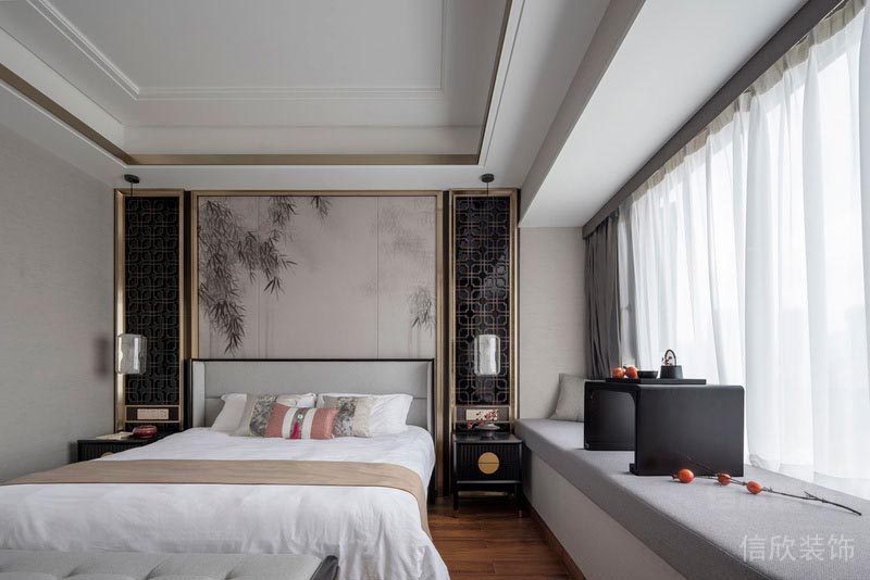古典雅致的實木鏤空雕花屏風、富有東方氣韻的淡彩墨竹壁畫背景,以及半透明的玻璃床頭吊燈,相互映襯,盡顯清雅與平和,展現著東方人文精神的傳承與蛻變,以豐富的細節展現出低調卻極富藝術性的生活品位。