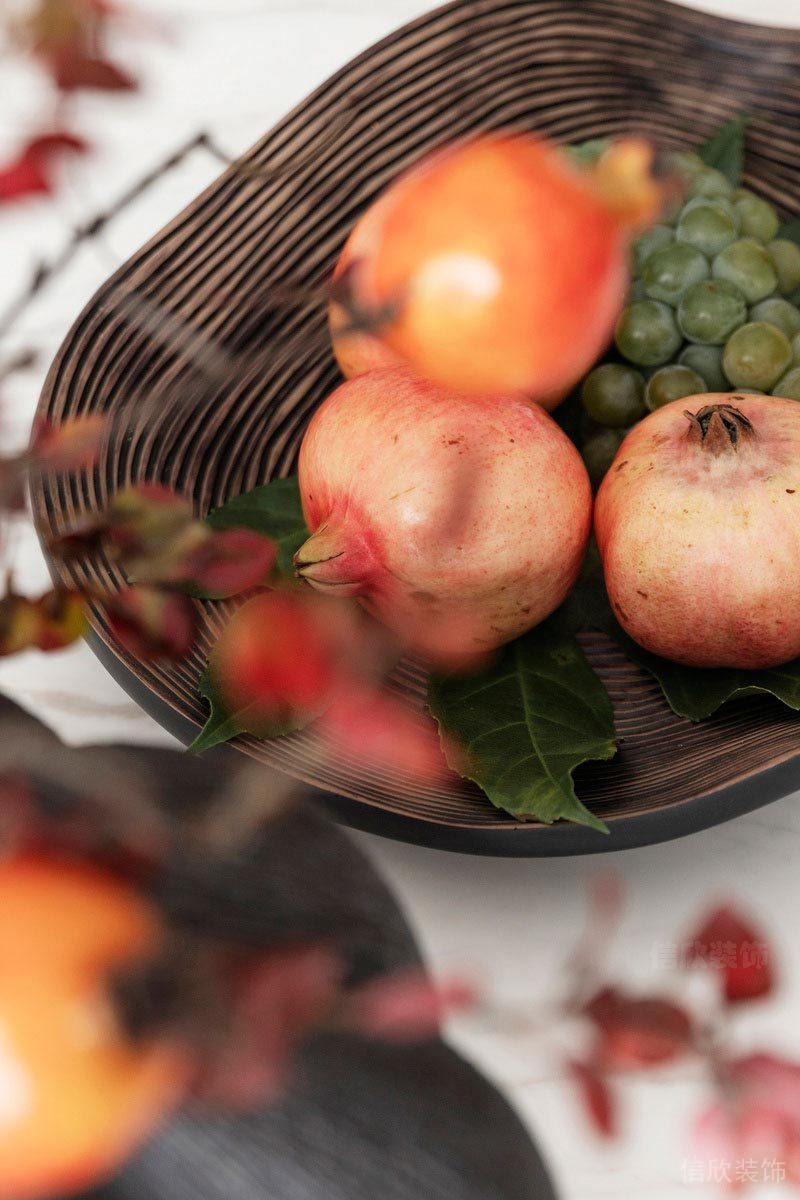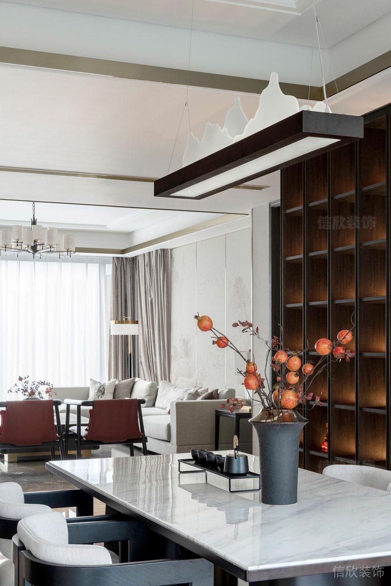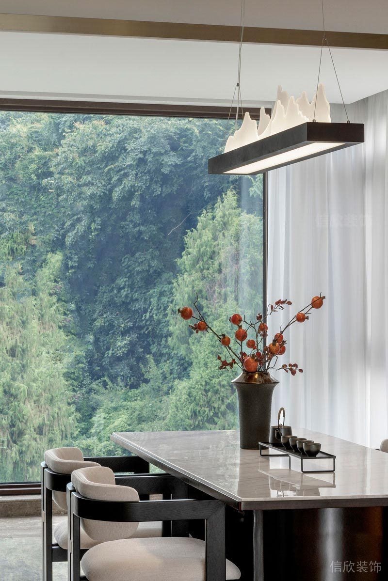 穿過玄關,進入過廳,左邊便是餐廳。實木布藝軟包座椅,極具設計感的扶手造型,碩果累累的鮮紅色石榴花藝,精致典雅的陶藝茶具,散發著濃郁的東方文化情懷。餐桌上方的半透明亞克力山形吊燈,與窗外的青山遙相呼應,在與自然的對話中,感受“久在樊籠里,復得返自然”的那份閑適與自在。