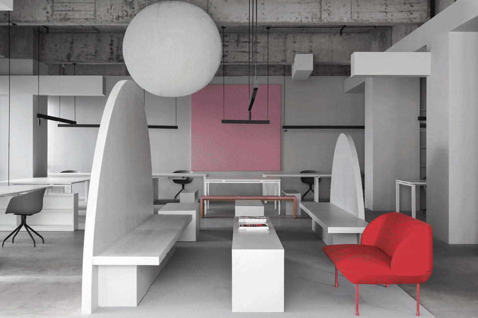 辦公區(qū),鋪環(huán)氧地坪漆,白色現(xiàn)代化辦公桌,灰色軟包隔斷,黑色噴漆不銹鋼工業(yè)風(fēng)吊頂,簡(jiǎn)約時(shí)尚,吊燈和射燈搭配增強(qiáng)光影效果。