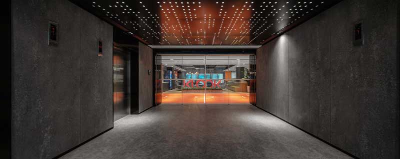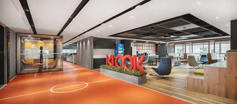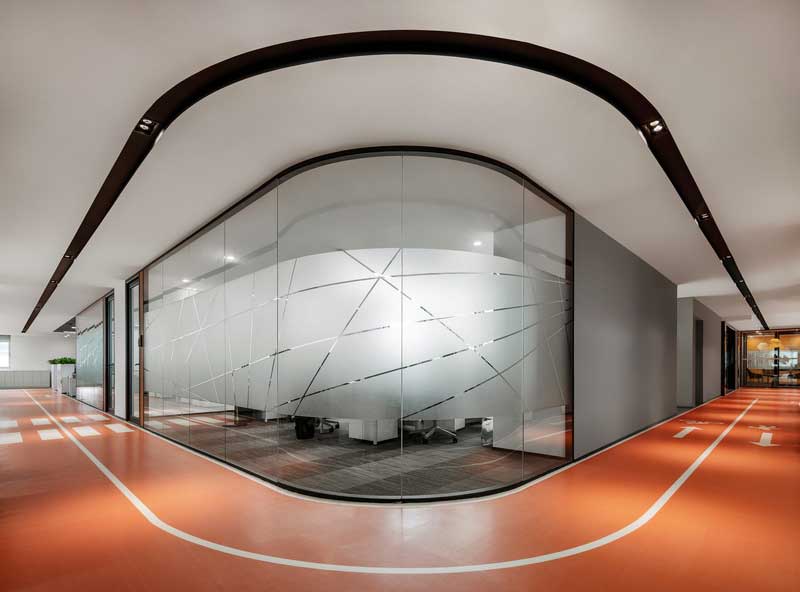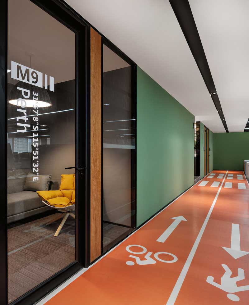 用企業色彩打造一條貫穿整個辦公空間的旅行跑道,沿路風景一覽無余,各部門及各功能區域在跑道兩側延伸,提高空間的工作效率