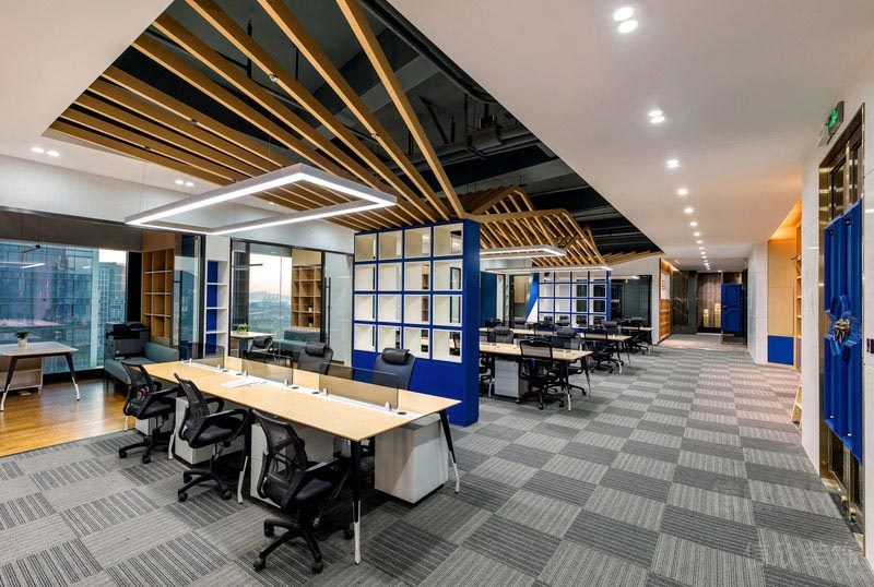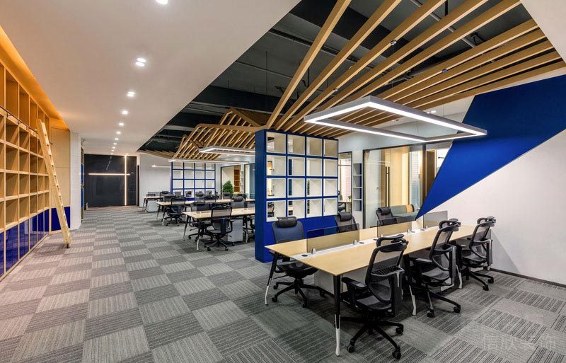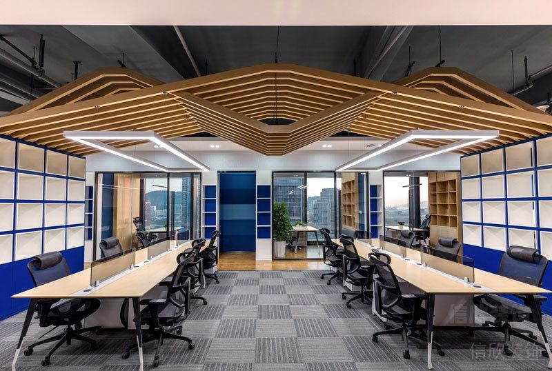 深圳南山現代中式風格辦公室員工辦公區的天花,一種是顏色較深的木紋鋁扁通,一種是顏色較淺的木紋鋁扁通,兩種明度不一的木色、不一的紋理形成了對比,既統一又不單調。