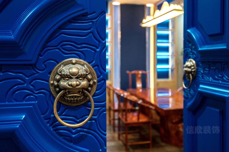 大門是以鋼化玻璃與寶石藍造型木相結合的,加以古銅的虎獅造型的門叩,運用現代的手法和材質還原了古典氣質,既顯示了中式韻味,又體現了現代風格的與時俱進。