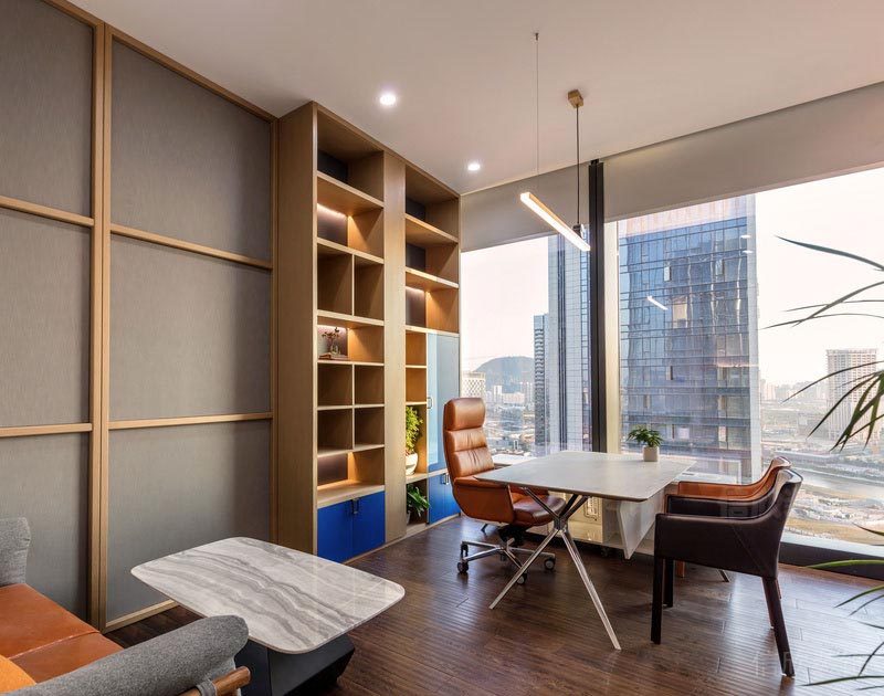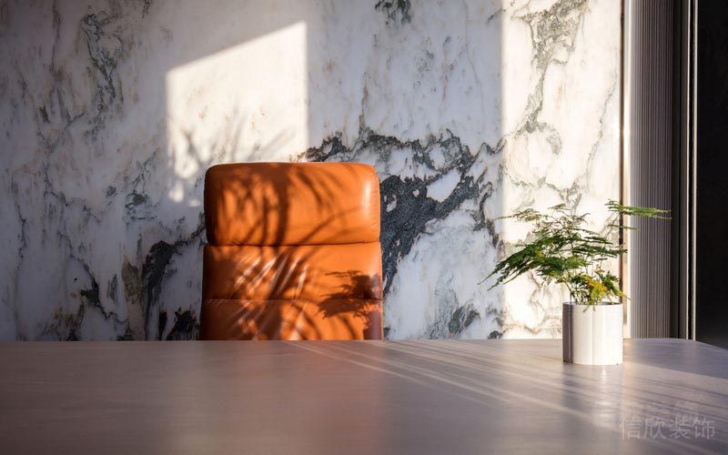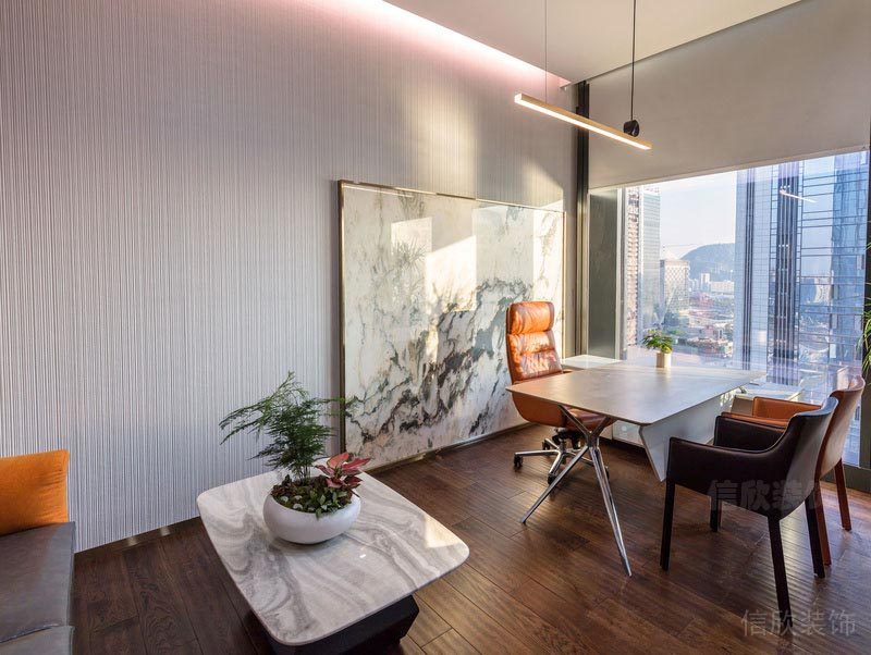 山水大理石背景及橘色辦公椅在夕陽下的照耀下,顯得格外迷人。可于繁忙后欣賞窗外風光、待客會友,也是趣事。