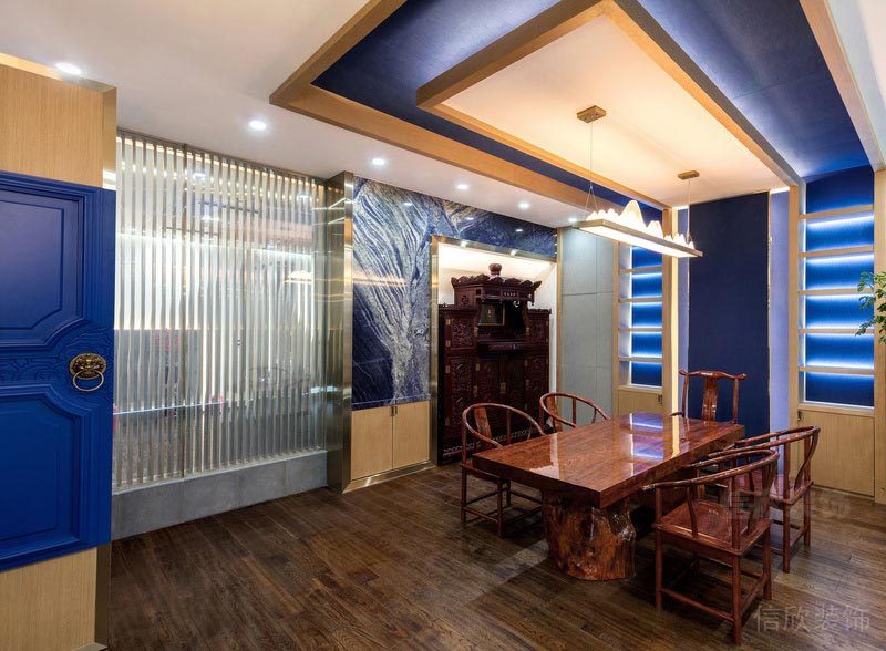 該項目以深厚的文化底蘊、深詣美學意境去詮釋現代辦公空間,設計師將人文情懷及現代中式的氣韻作為勾摹空間的輪廓線,強調整體空間色調和形態傳遞,奠定非凡氣度,令空間擁有一種大氣敞闊又意境悠遠的深意。位置坐落于深圳南山高新南七道粵美特大廈,是一個現代中式風格辦公室裝修案例,入口門廳作為進入辦公室的第一眼視覺空間,在設計和規劃上更關注場景營造和縱深感,賦予辦公室更大的想象空間,寶石藍色調的藝術雕花門板彰顯出誘人的裝飾魅力,前廳接待區展示開放、好客的形象,同時飽含中式傳統文化的審美意蘊,整體空間輕松雅致的氛圍,可讓工作人員和訪客在此愉悅地開展工作。