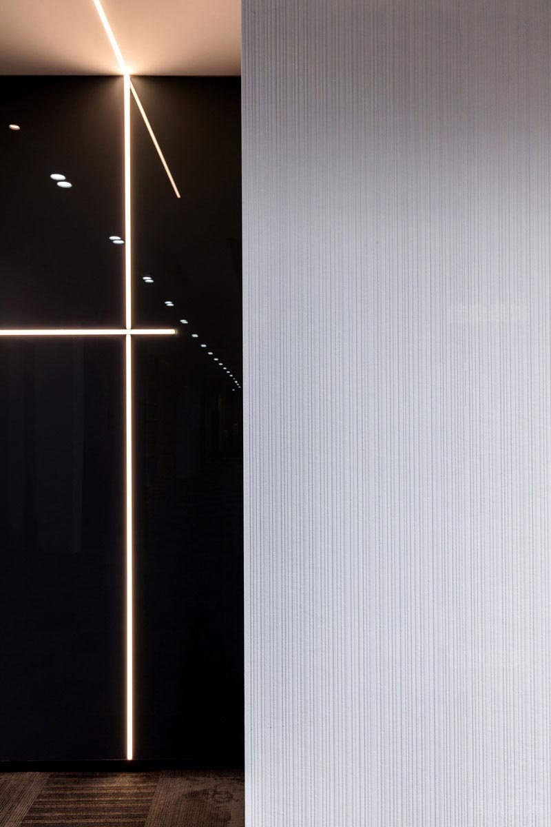 白色的光觸媒磁化板墻面與黑灰色的玻璃形成了黑白顏色對比強烈的效果,加以點綴線形的嵌入式燈條,更加突出了過道這一端景特別之處。靈活運用了點、線、面多種形式的表現方式,使得畫面黑、白、灰變化豐富,虛實層次錯落有致,疏密空白安排得體。