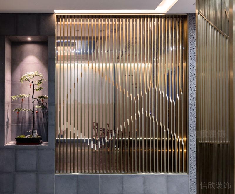 深圳南山現代中式風格辦公室的玄關觀景區高低起伏的不銹鋼造型隔斷,像是一座座連綿不斷的山巒,后面是通電玻璃,在透明情況下可以在觀景區通過玻璃看到外面的海景,將此處的視覺空間延伸出去,若打開通電玻璃開關則可關閉透明狀態,保護了董事長室的隱私性,既達到視覺的通透性,又滿足了區域功能的劃分。不銹鋼隔斷在陽光的照耀下,通過反射可以將此處變成一處熠熠生輝的金屬風景。