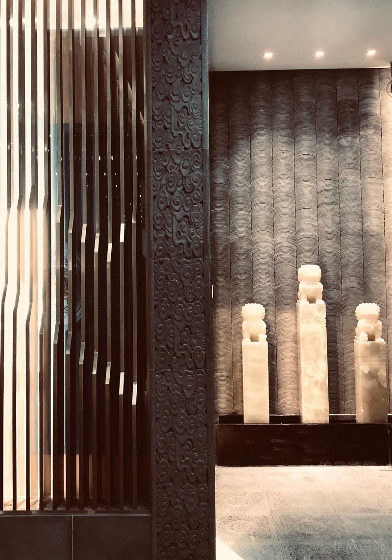 深圳南山現代中式風格辦公室玄關觀景區屏風局部的墻面則是用較現代但又不失古典的水泥石,既延伸了員工辦公區的現代風格,又不破壞入門過道空間的調性,保留了入門過道空間的完整性。董事長室門垛兩旁傳統祥云的文化圖騰,水景墻面豎貼的灰瓦,及三座白玉的石獅,極大豐富了空間的表情,更加增加了現代中式文化的氣息。