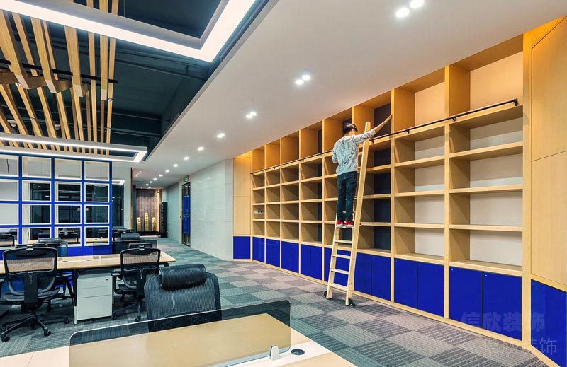 運用大面積的書柜,擴展空間的橫豎立體感和規整性,從而增添空間的時尚個性氣息;也極大增加了儲存空間。大面積的書架或是滿載富含知識的書籍,或是擺放精美的瓷器、藝術陳設,或是擺放公司的榮譽證書等,這些物品都可以將公司的內容和文化體現出來。